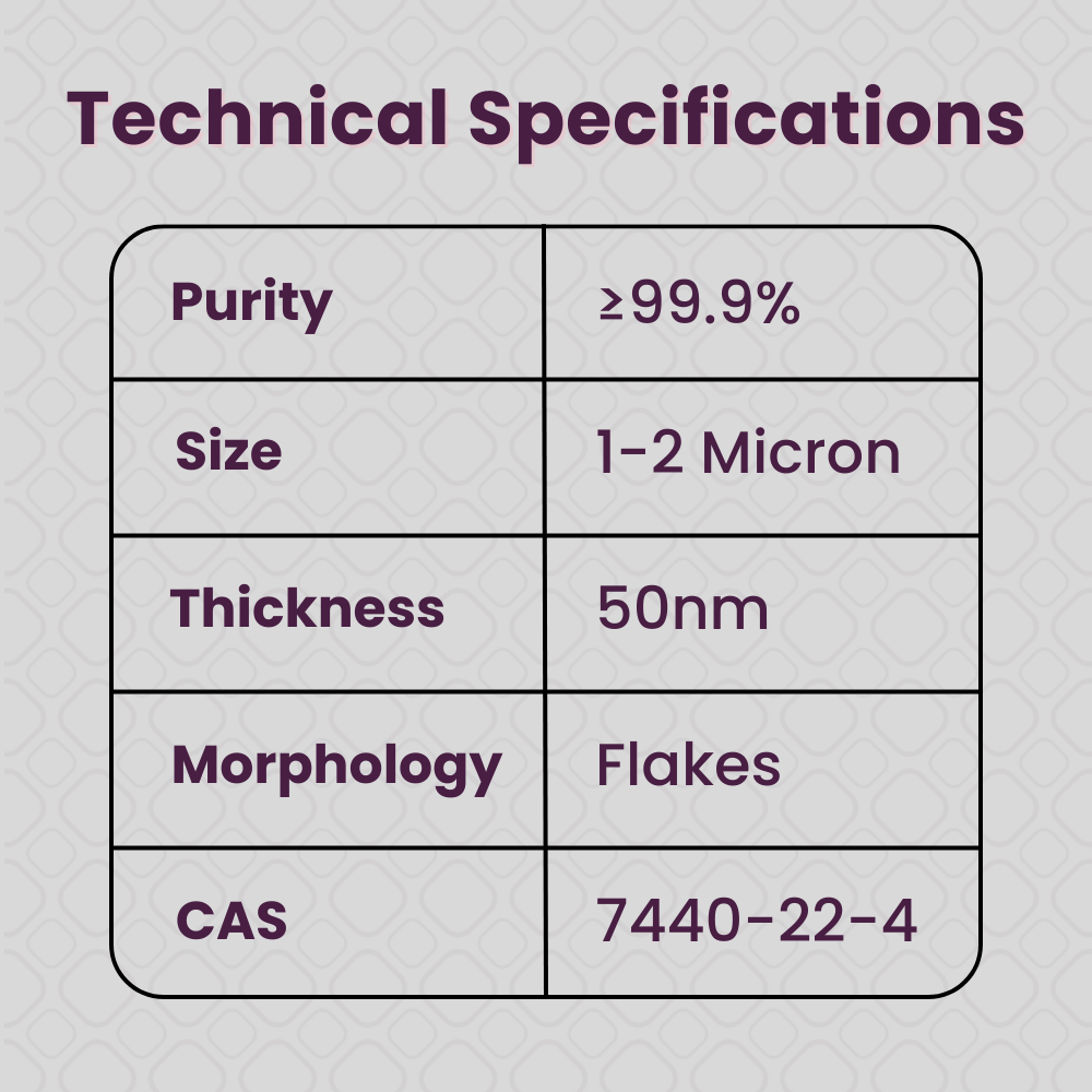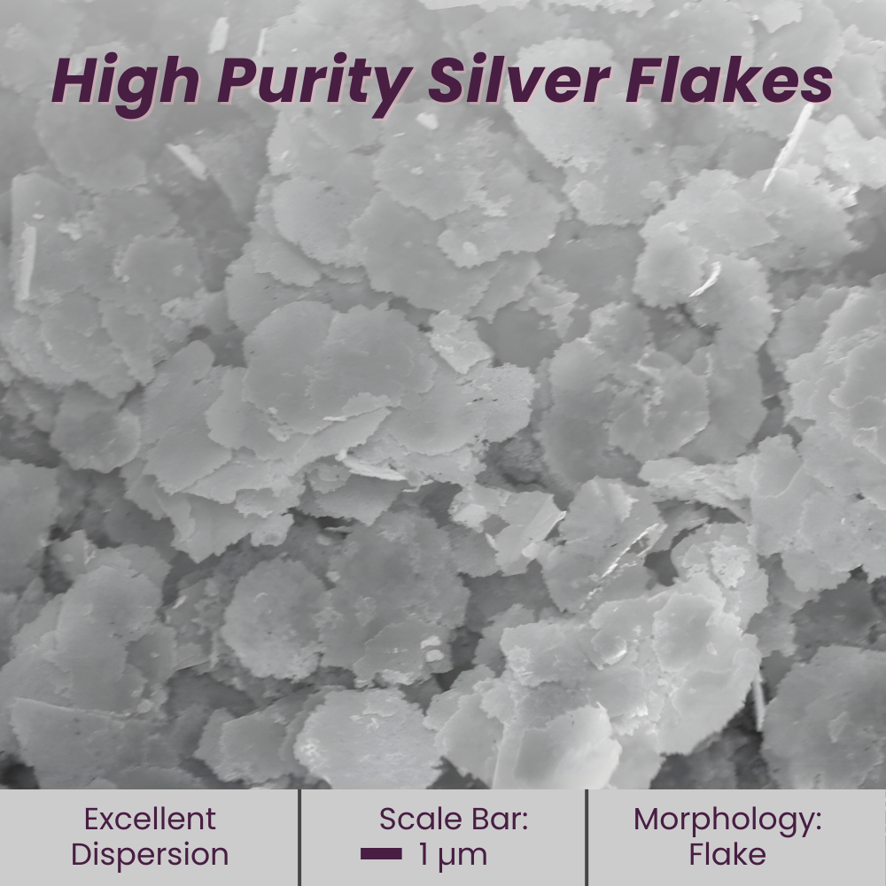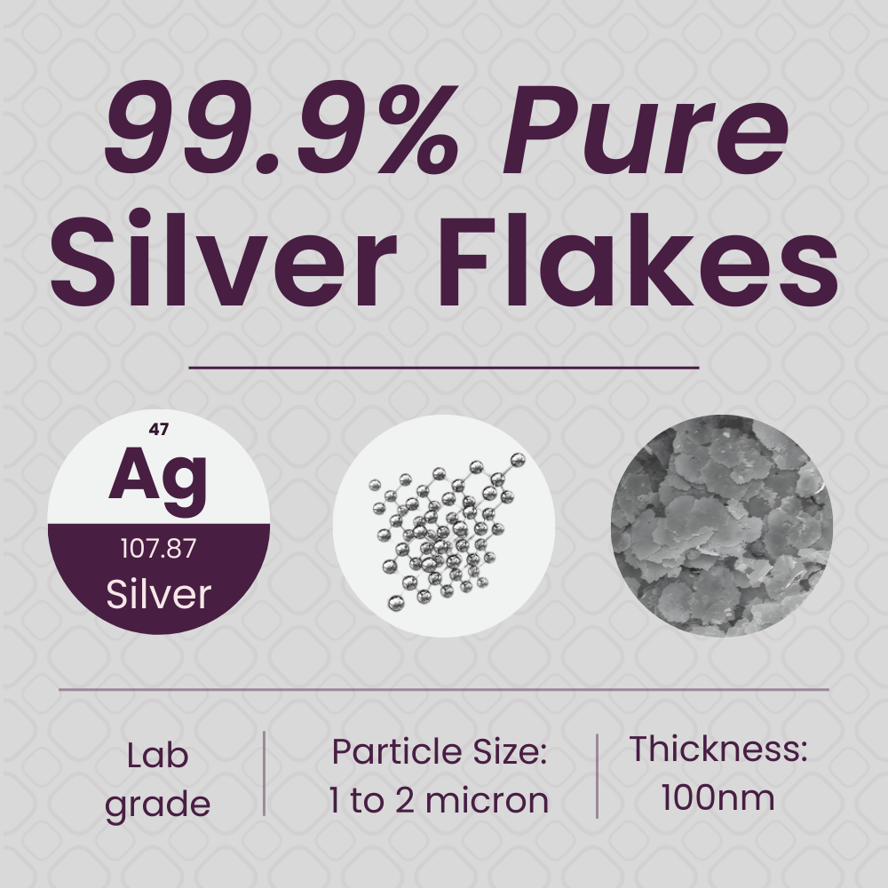 This 99.9% pure silver powder (CAS 7440-22-4, Ag, molecular weight 107.87 g/mol) features 1–2 micron flakes with ~50 nm thickness, delivering exceptional electrical, thermal conductivity with antibacterial properties which can be used for conductive inks & Paste, electrodes, EMI shielding, sensors, electrical contacts, medical application for antibacterial properties and high-end research. Its ultra-fine structure disperses easily into polymers, epoxies, and solvents, producing low-resistance, smooth coatings. Designed for labs, engineers, and makers, it ensures durable, efficient, and professional-grade performance