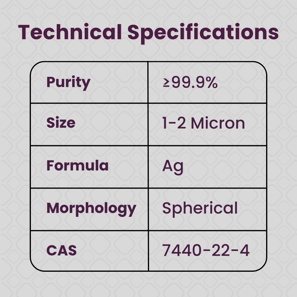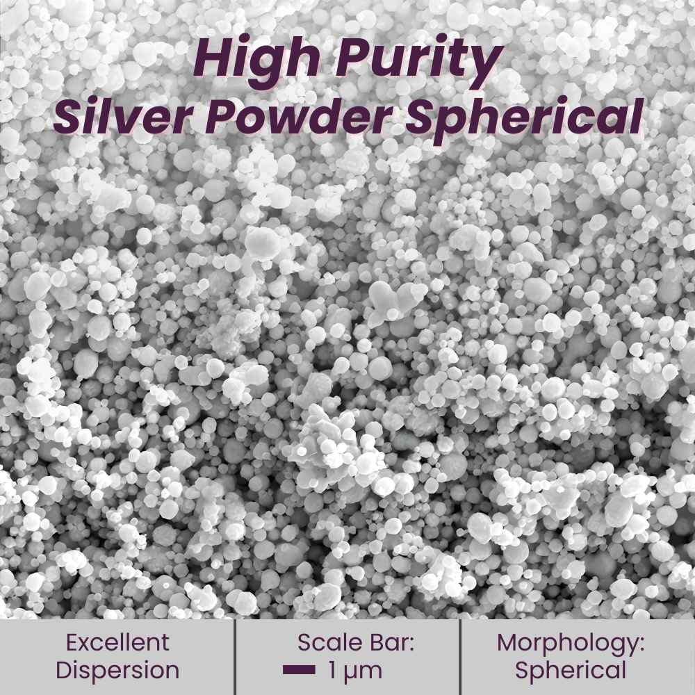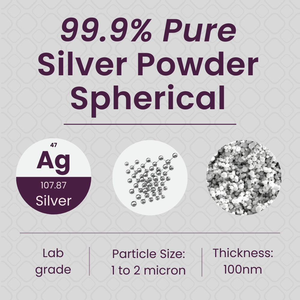 This 99.99% pure spherical silver powder (CAS 7440-22-4, Ag, 1–2 micron) provides exceptional electrical conductivity, flow, and dispersion for sensor manufacturing, electrical contacts, antimicrobial coatings, electrode formulations, conductive composites, and advanced R&D. Its highly uniform spherical particles pack efficiently, improving electrical and thermal performance across electronics, RF systems, solar applications, and scientific experiments. Designed for engineers and researchers requiring reliable, high-purity silver for precision innovation.